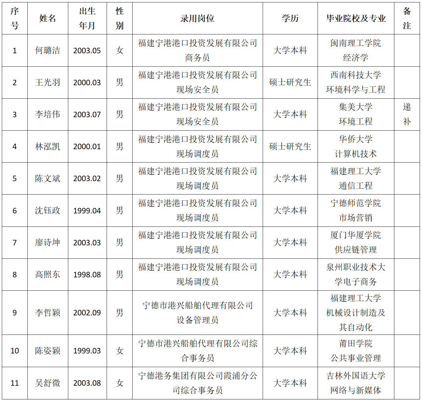 寧德港務(wù)集團(tuán)有限公司2025年春季校園招聘擬錄用人員名單公示